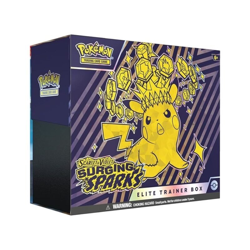Pokemon Surging Sparks Elite Trainer Box – Includes: • 9 Pokémon TCG: Scarlet & Violet—Surging Sparks booster packs • 1 full-art foil promo card featuring Magneton • 65 card sleeves • 45 Pokémon TCG Energy cards • A player’s guide to the Scarlet & Violet—Surging Sparks expansion • 6 damage-counter dice • 1 competition-legal coin-flip die • 2 plastic condition markers • A collector’s box to hold everything, with 4 dividers to keep it organized • A code card for Pokémon Trading Card Game Live